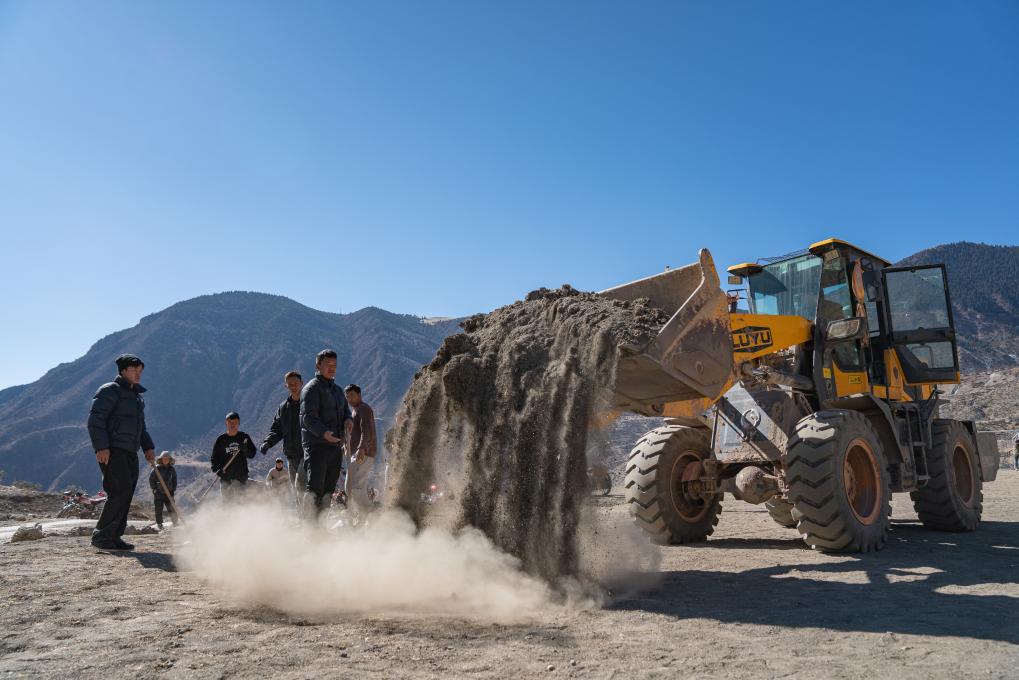 在馬利村的足球場(chǎng)上,球員嘎瑪加永燈培的爸爸用裝載機(jī)平整地面(2024年1月20日攝)。新華社記者 丁增尼達(dá) 攝