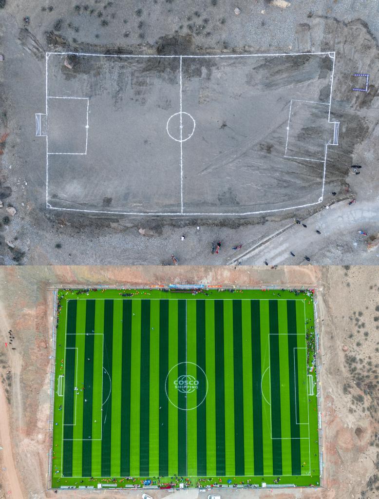 拼版照片:上圖為馬利村平整后的足球場(chǎng),曾經(jīng)馬利鎮(zhèn)多項(xiàng)賽事都是在這片簡(jiǎn)易球場(chǎng)上進(jìn)行(2024年1月20日攝,無人機(jī)照片);這是2024年12月竣工的馬利鎮(zhèn)11人制標(biāo)準(zhǔn)化足球場(chǎng)“云中球場(chǎng)”(2025年1月3日攝,無人機(jī)照片)。新華社記者 丁增尼達(dá) 攝