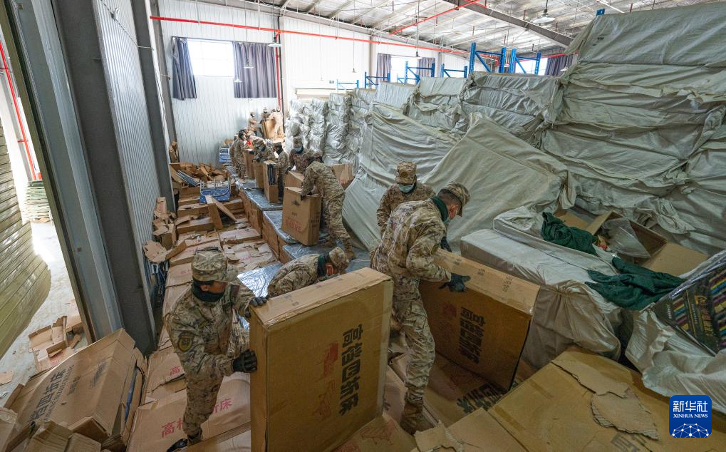 1月8日,在日喀則市經(jīng)開區(qū)物資儲備倉庫,武警官兵在搬運抗震救災物資。新華社記者 丁增尼達 攝