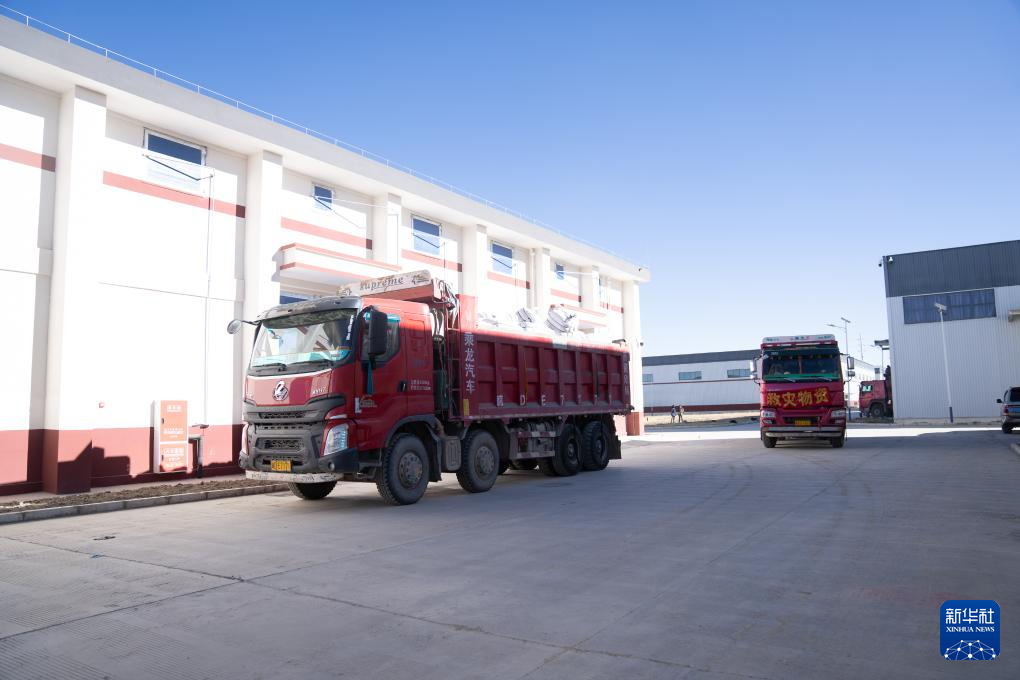 1月8日,在日喀則市經(jīng)開區(qū)物資儲備倉庫,裝好抗震救災物資的車輛駛出園區(qū)。新華社記者 丁增尼達 攝