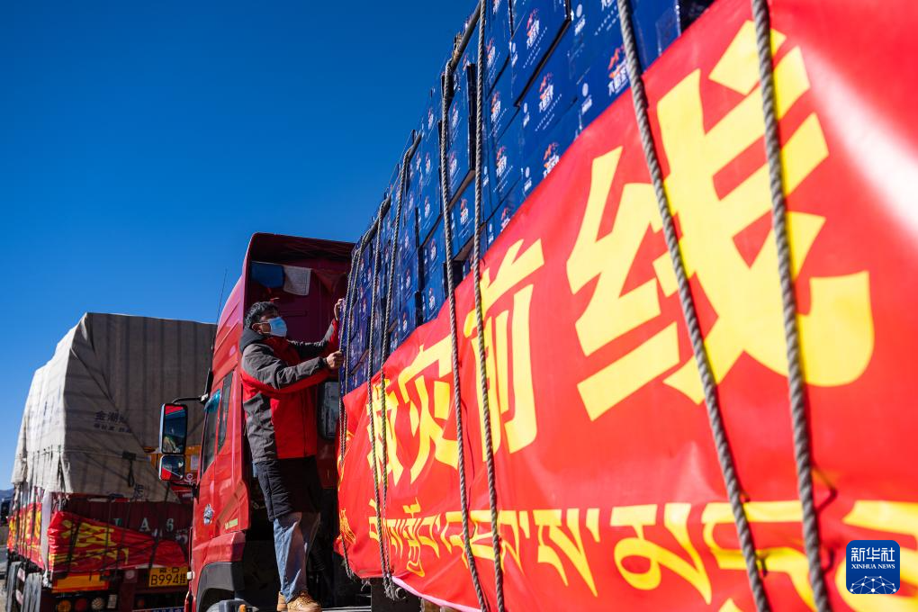 1月8日,在日喀則市境內(nèi)的318國道旁,中國郵政的抗震救災物資運輸車輛向震中方向駛?cè)?。新華社記者 丁增尼達 攝