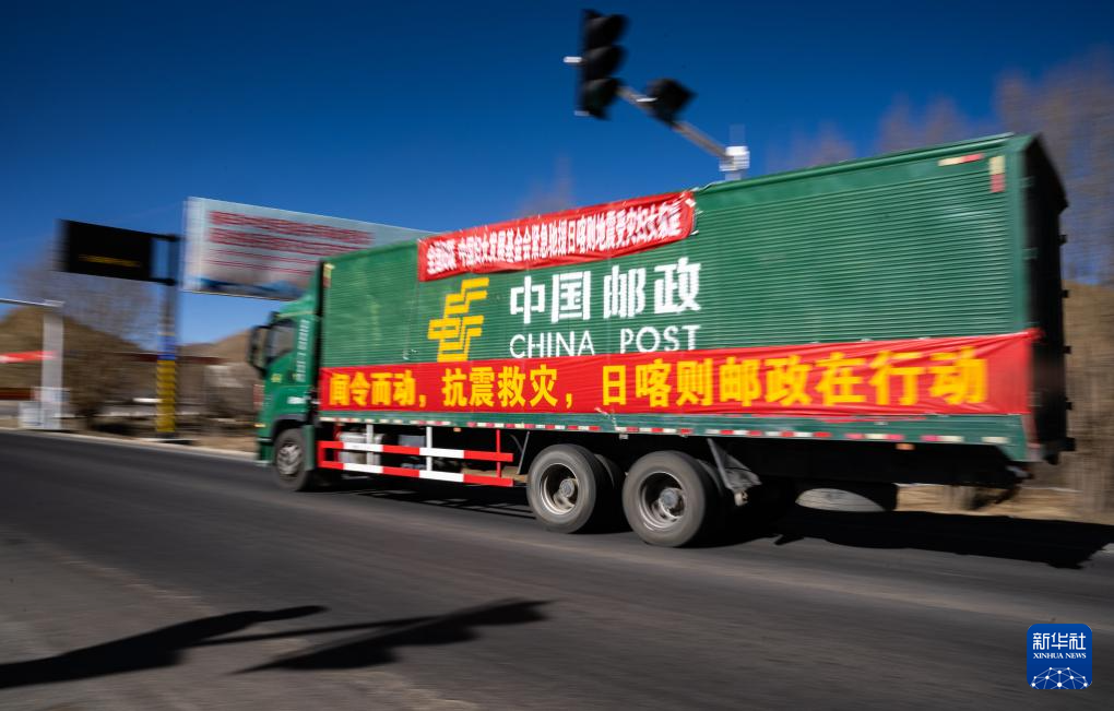 1月8日,在日喀則市境內(nèi)的318國道,中國郵政的抗震救災(zāi)運輸車輛向災(zāi)區(qū)方向駛?cè)?。新華社記者 丁增尼達 攝