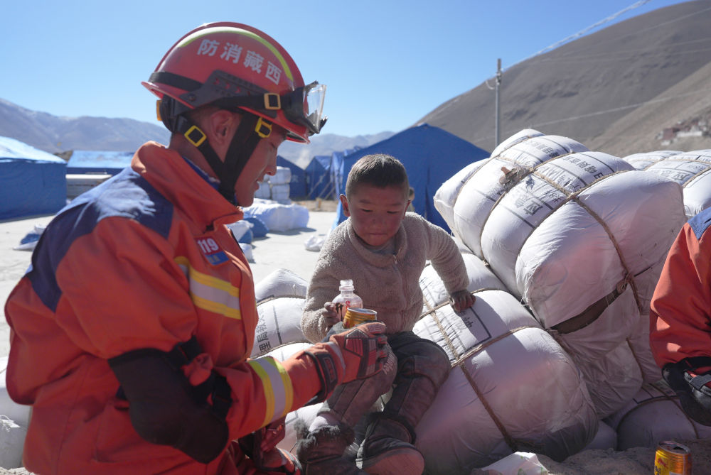 2025年1月8日,在定日縣措果鄉(xiāng)塘仁村安置點,消防救援人員和小朋友互動。新華社記者 晉美多吉 攝