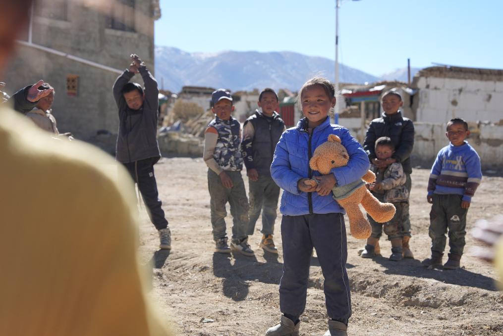 1月8日,在日喀則市定日縣措果鄉(xiāng)塘仁村地震災(zāi)后安置點(diǎn),西藏星光社會工作服務(wù)中心社工向孩子們贈送玩偶熊,并給他們表演節(jié)目。