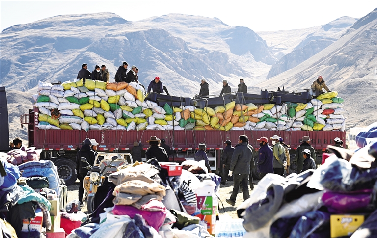 1月9日,受災(zāi)群眾在措布村卸載救災(zāi)物資。 新華社記者 李響 攝