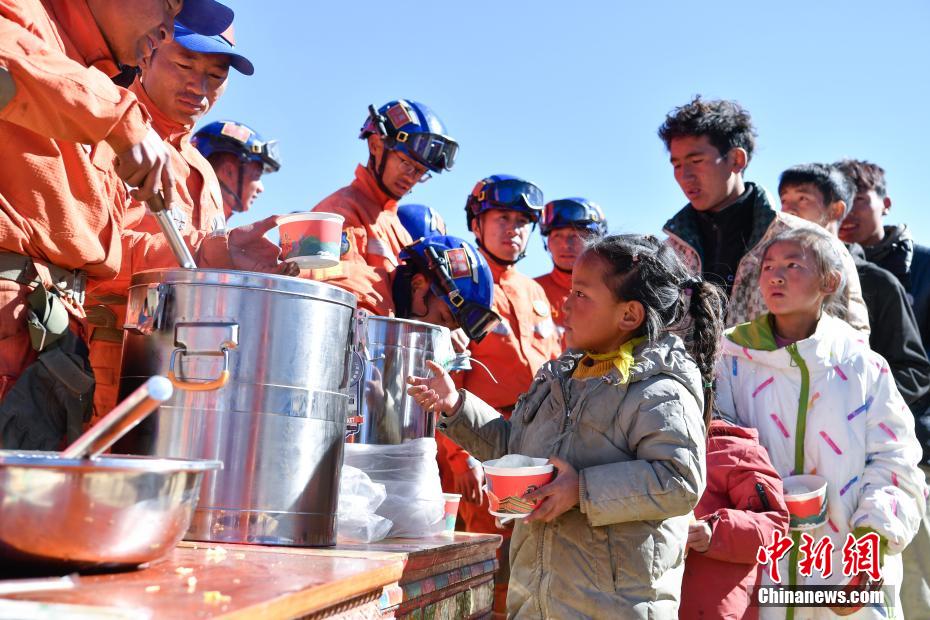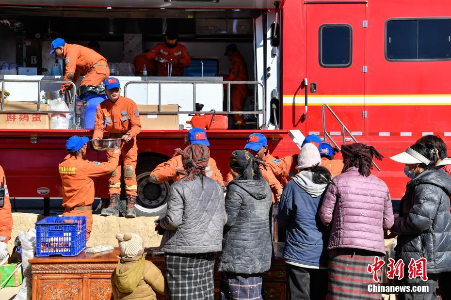 1月9日,西藏自治區(qū)定日縣曲洛鄉(xiāng)措昂村安置點(diǎn),西藏自治區(qū)森林消防總隊(duì)救援人員為受災(zāi)民眾提供飲食。當(dāng)日,位于西藏自治區(qū)定日縣曲洛鄉(xiāng)措昂村安置點(diǎn),西藏各級救援人員和愛心企業(yè)不斷轉(zhuǎn)運(yùn)、發(fā)放生活物資、搭建活動板房、全力保障受災(zāi)民眾的飲食供應(yīng)等,保障受災(zāi)民眾基本生活。中新社記者 貢嘎來松 攝
