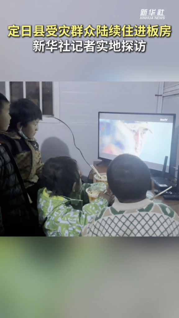 11日,西藏定日縣長所鄉(xiāng)古榮村板房安置點接通寬帶、IPTV網絡電視。孩子們圍坐在電視機前,說想要觀看電影《戰(zhàn)狼》。這是此次西藏定日縣6.8級地震災區(qū)第一個接通有線千兆寬帶和IPTV網絡電視、實現Wi-Fi覆蓋的活動板房。