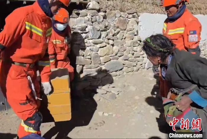 圖為日喀則市森林消防大隊(duì)隊(duì)員將受損房屋內(nèi)搜尋到的財(cái)物交付受災(zāi)村民手中。米瑪次仁 攝
