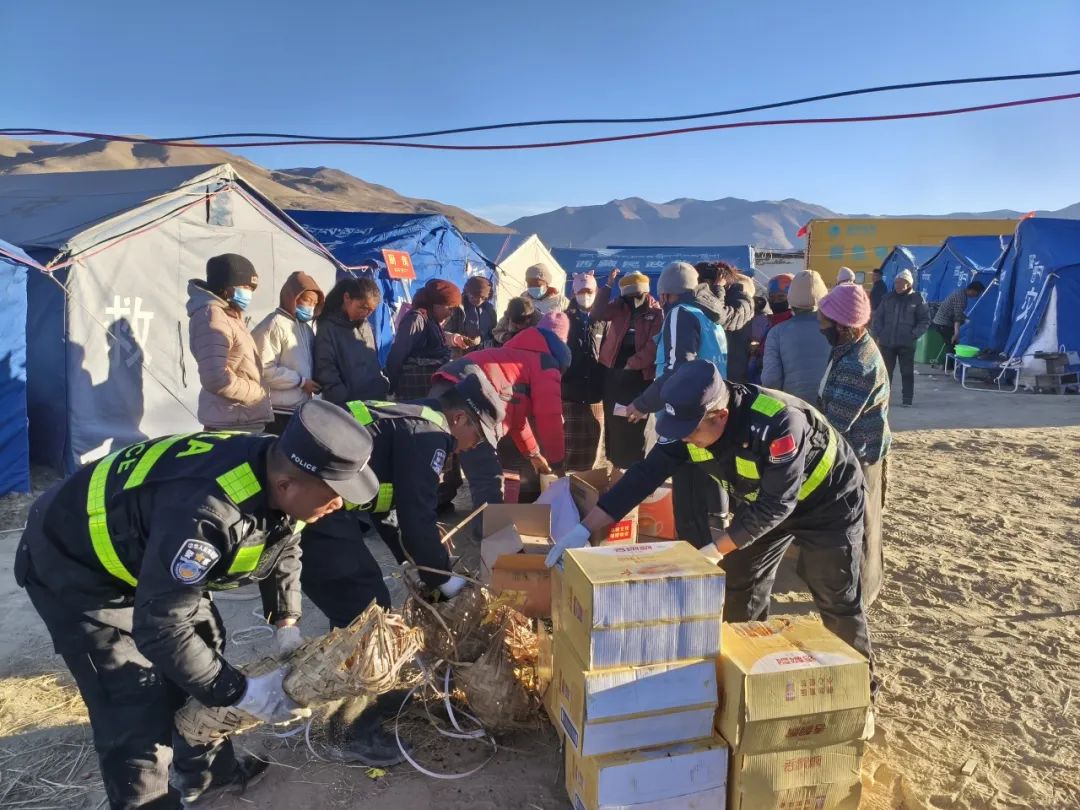 圖為在日喀則市定日縣長所鄉(xiāng)嘎布村安置點,日喀則邊境管理支隊嘎布村“帳篷警務室”民警幫助群眾卸載救災物資。貢嘎齊平 攝
