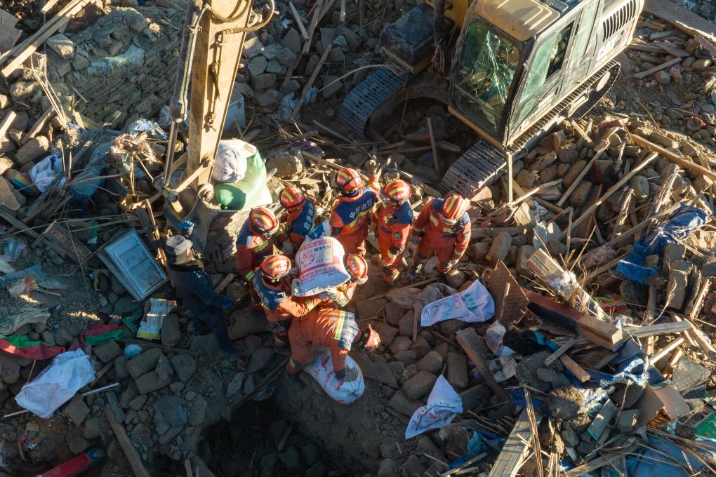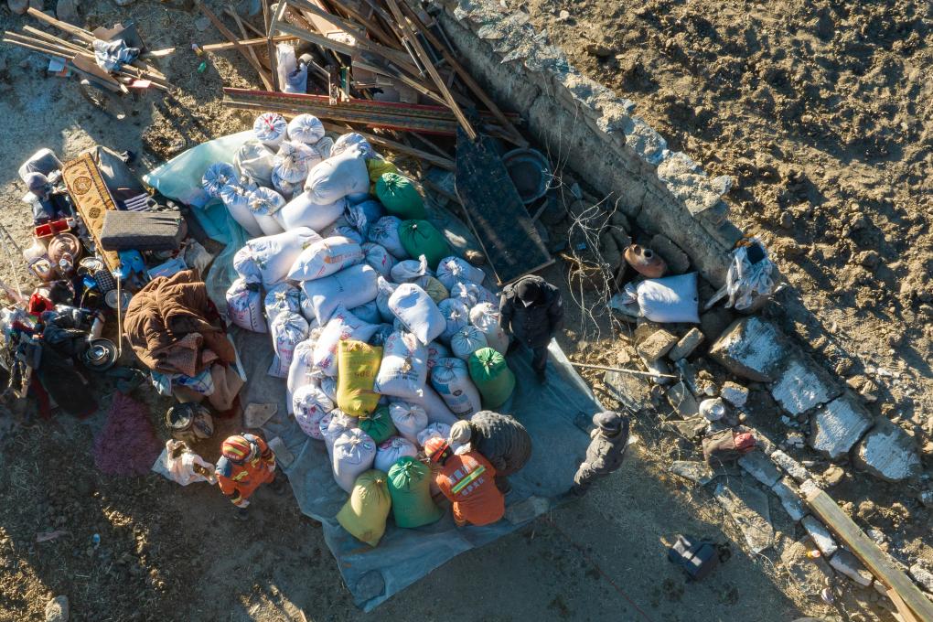 1月13日,在定日縣長(zhǎng)所鄉(xiāng)古榮村,消防員們?cè)诎徇\(yùn)從廢墟中搶救出的青稞(無(wú)人機(jī)照片)。新華社記者丁增尼達(dá) 攝