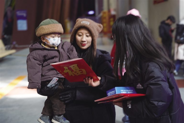 1月14日15時許,拉薩火車站候車大廳人頭攢動,熱鬧非凡?;剜l(xiāng)的人們臉上都洋溢著幸福的笑容,期待著歸家的旅途?!澳愫?,送你們一副對聯(lián),祝你們新春快樂?!焙蜍噺d內(nèi),自治區(qū)總工會的工作人員將一副副喜慶的對聯(lián)送給踏進(jìn)火車站的人們,為他們送上新春的祝福和溫暖。