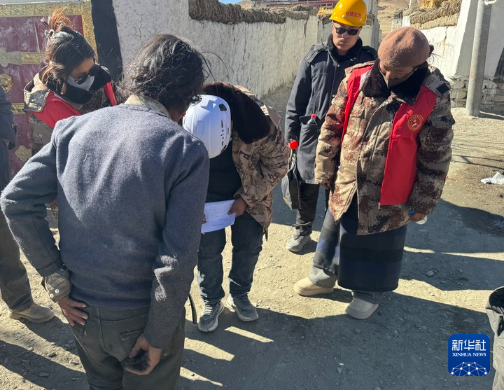 1月13日,次旺(右一)陪同工作組走訪(fǎng)村莊,評(píng)估房屋受損程度。新華社記者 格桑邊覺(jué) 攝