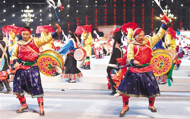 在七市(地)非遺舞蹈整合展示部分,歌舞節(jié)目《鼓潮》將熱巴鼓、背鼓、腰鼓、斯馬卓這四種西藏非遺舞蹈融合在一起,場面氣勢恢宏,給觀眾帶來震撼的視覺盛宴。