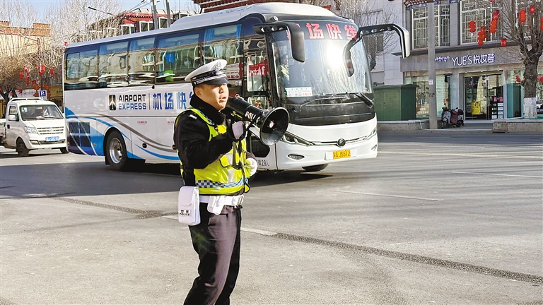 拉薩市城關區(qū)娘熱路上,交警在指揮車輛通行。記者 余書冉 攝