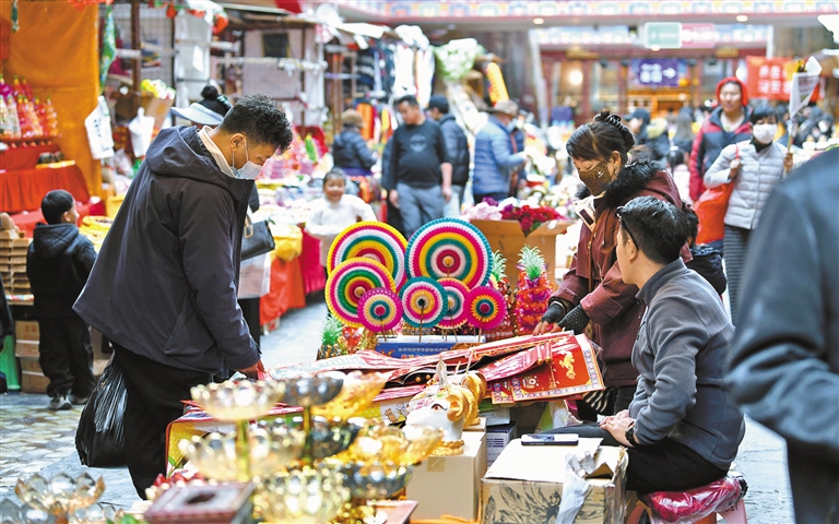 藏歷新年將至,拉薩市大街小巷熱鬧非凡。年貨一條街、超市、商店?duì)幭嗤瞥龈魇侥曦洠鞣N商品琳瑯滿目,置辦年貨的人摩肩接踵。古城拉薩在歡樂(lè)祥和的氛圍中喜迎藏歷新年。