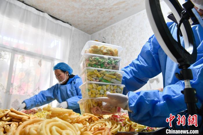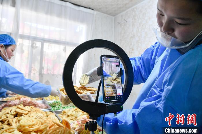 2月10日,西藏拉薩市林廓北路一家卡塞店里,工人在直播賣卡塞?!翱ㄈ笔且环N油炸面食,是藏歷新年必不可少的食物。隨著藏歷新年的日益臨近,古城拉薩各個加工銷售“卡塞”的店鋪飄出陣陣香味。中新社記者 貢嘎來松 攝