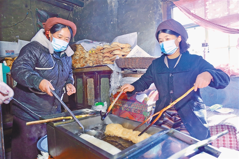 旦索朗一家,在每年藏歷新年前夕,都會開啟一年中最為繁忙的時光——經(jīng)營“卡賽”生意。旦索朗回憶往昔,感慨萬千:“小時候過年,炸‘卡賽’是家家戶戶的頭等大事,整個村子都彌漫著誘人的香氣,那是新年專屬的味道。如今,時代在變遷,人們的生活方式也發(fā)生了改變,越來越多的人選擇購買成品‘卡賽’,這既契合了快節(jié)奏的現(xiàn)代生活,也為我們提供了發(fā)展的機遇。我們經(jīng)營‘卡賽’生意已有6年,這期間,靠著誠信經(jīng)營和對高品質(zhì)的堅守,生意蒸蒸日上,還帶動了6名村民共同增收,大家一起用雙手創(chuàng)造美好生活?!?/p>