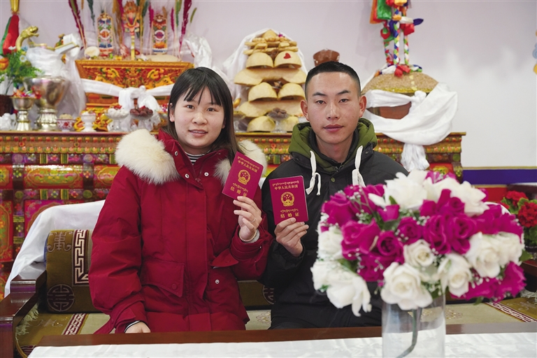 “我們在一起3年了,是表姐牽的紅線?!钡┰龈峦吣樕涎笠缰腋5男θ?,緩緩說道,“初次見到卓嘎,我就對她心生好感。相處一段時間后,我發(fā)現(xiàn)她性格溫柔,和我特別合拍,于是鼓起勇氣向她表白?!彼_心地展示著剛剛領到的結(jié)婚證,“情人節(jié)是個好日子,我們早就計劃好今天領證,現(xiàn)在終于如愿以償。以后情人節(jié)和結(jié)婚紀念日合二為一,既能少買一份禮物,也不用擔心忘記啦?!?/p>