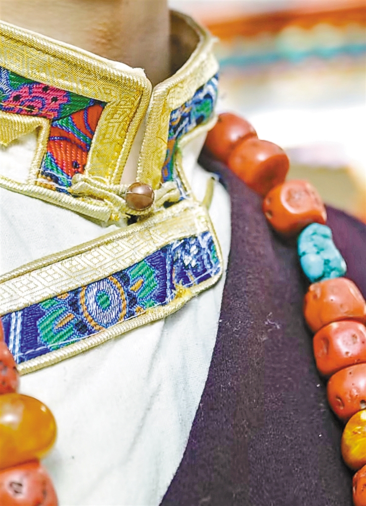 男士們大多身著用家織氆氌制作的藏袍,以黑、白色為主,領(lǐng)口、袖口、下擺等位置鑲嵌著精美的“十”字紋花邊。他們頭戴金花帽,腳穿“松巴”鞋,整個裝扮既展現(xiàn)了高原男子的粗獷與豪放,又透露出一種對細(xì)節(jié)的極致追求。女士們的服飾則更加豐富多彩,她們穿著黑色氆氌藏袍,內(nèi)搭彩色襯衫,系著彩虹條紋的“邦典”,已婚女子還會將各色絲線編入頭發(fā)中形成發(fā)辮,恰似高原上綻放的花朵。