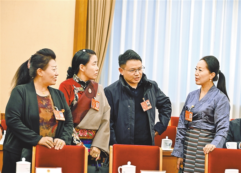 全國人大代表在會(huì)議間隙交流審議內(nèi)容。