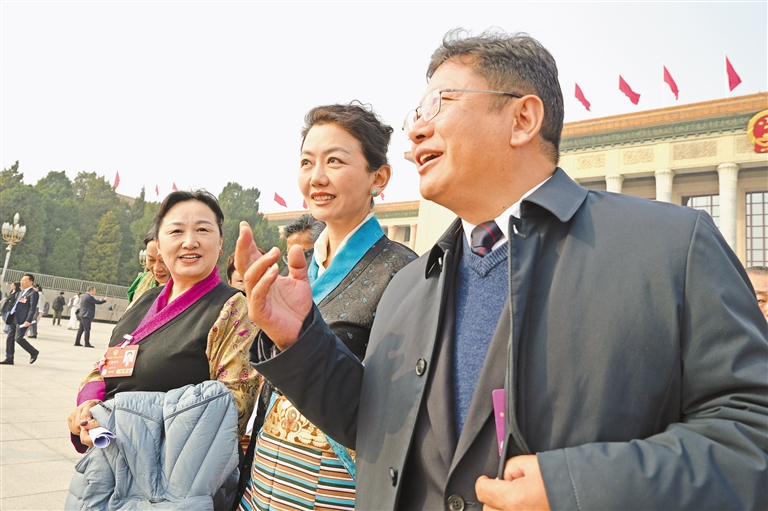 圖為住藏全國政協(xié)委員白瑪玉珍(中)在“委員通道”上介紹墨脫的發(fā)展變化。記者 旦增平措 次旦央吉 攝