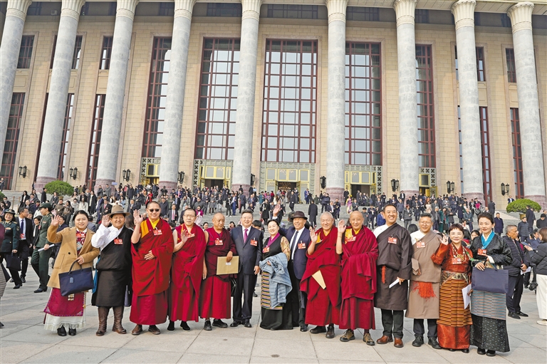 圖為住藏全國政協(xié)委員等參會(huì)人員在人民大會(huì)堂前合影留念。記者 旦增平措 次旦央吉 攝