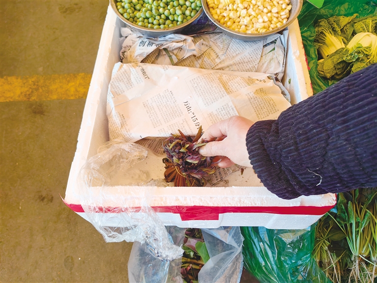 “今天早上賣的香椿芽每斤100元,中午就剩這兩把了,降價了,香椿芽每斤80元?!焙⒁陶f。隨后,張女士購買了兩小把香椿芽,共計48元。
