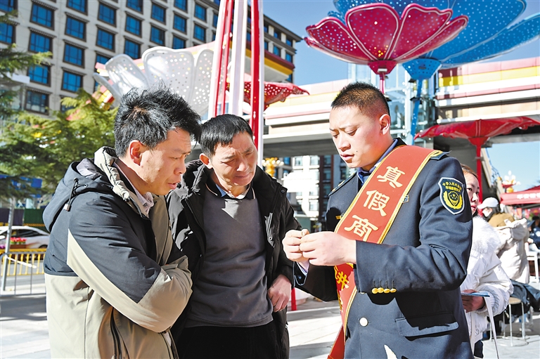 圖為桑珠孜區(qū)市場監(jiān)管局投訴舉報中心負責人李良友(右)向市民講解商品真假辨別方法。 記者 扎西頓珠 攝