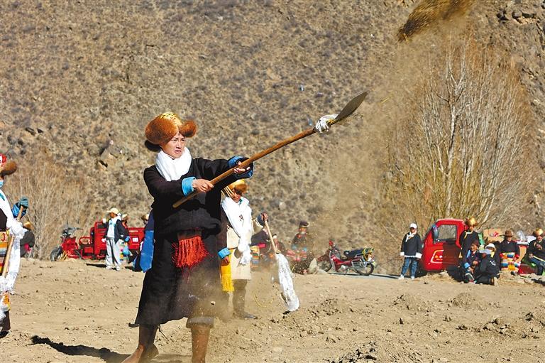 林芝市工布江達縣工布江達鎮(zhèn)阿沛村春耕春播儀式上,被推選為“播種者”的次旦拉姆身著盛裝,撒下青稞種子。記者 謝筱純 攝