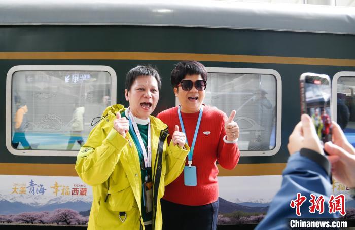3月26日,乘坐青海首趟直達(dá)西藏林芝旅游專列的旅客與列車合影留念?!●R銘言 攝