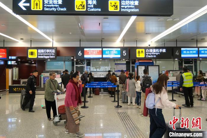 圖為3月31日,由拉薩飛往尼泊爾博卡拉的旅客在拉薩貢嘎國際機場辦理乘機手續(xù)。江飛波 攝