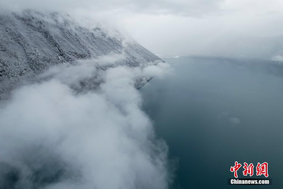 巴松錯(cuò)位于西藏林芝工布江達(dá)縣境內(nèi),地處巴河上游的高山峽谷中,是西藏首個(gè)自然風(fēng)景類國家5A級旅游景區(qū)。4月5日,巴松錯(cuò)迎來一場春雪,雪后四周原始森林猶如蒙上潔白面紗,湖面宛如一面藍(lán)寶石鑲嵌其中,風(fēng)光如畫。圖為4月5日,雪后巴松錯(cuò)四周云霧繚繞,猶如仙境。(無人機(jī)畫面)中新社記者 江飛波 攝