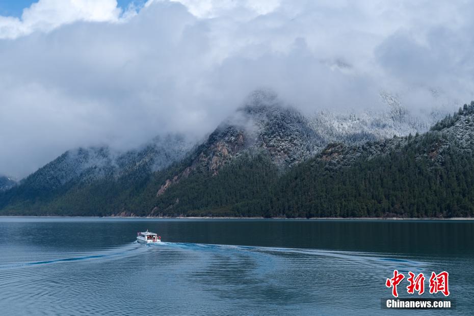 巴松錯(cuò)位于西藏林芝工布江達(dá)縣境內(nèi),地處巴河上游的高山峽谷中,是西藏首個(gè)自然風(fēng)景類國家5A級旅游景區(qū)。4月5日,巴松錯(cuò)迎來一場春雪,雪后四周原始森林猶如蒙上潔白面紗,湖面宛如一面藍(lán)寶石鑲嵌其中,風(fēng)光如畫。圖為4月5日,游客乘船游覽巴松錯(cuò)。中新社記者 江飛波 攝