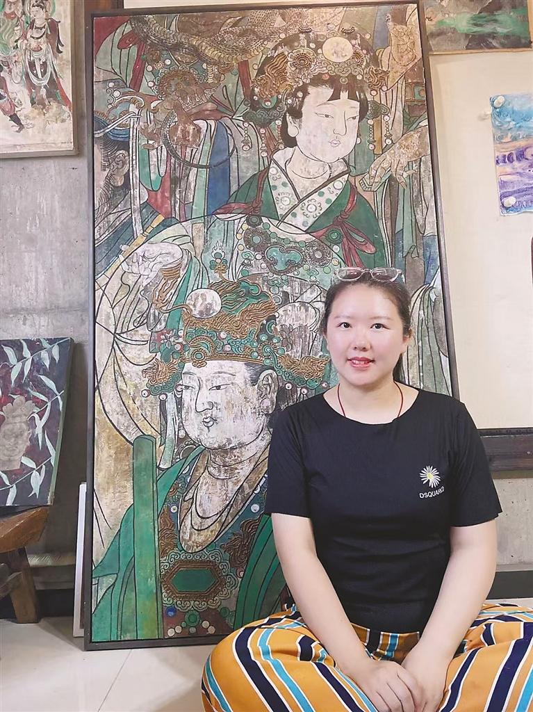劉曉彤的靈感源于在考察研究時學(xué)習(xí)到的巖彩畫技法,她運(yùn)用巖彩這一千年不變色的傳統(tǒng)工藝技法與古人“對話”,并在繪畫過程中通過對描繪畫面現(xiàn)狀的斑駁肌理感與賦彩,摹寫古代壁畫的現(xiàn)狀,傳承和感受古典美。