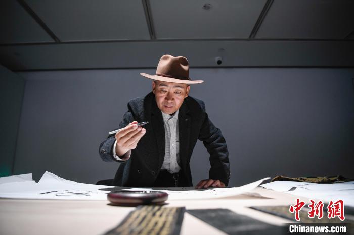圖為展覽現(xiàn)場,藏文書法創(chuàng)作。中新社記者 貢嘎來松 攝