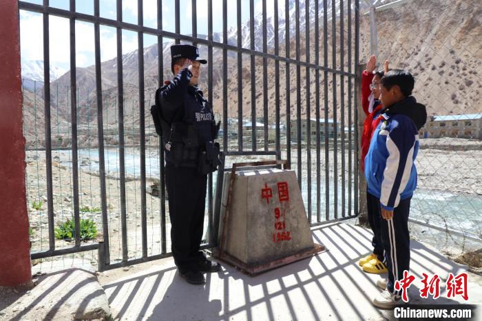 圖為普蘭邊檢站移民管理警察與駐地學校學生在界碑前相互敬禮。格熱 攝