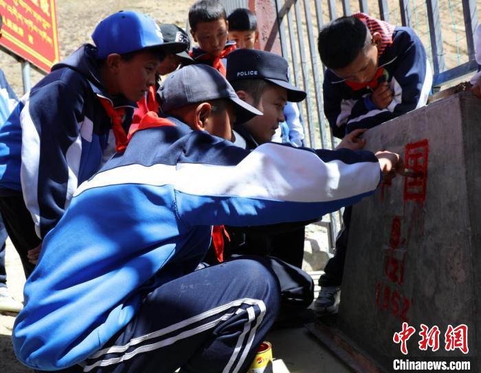 圖為普蘭邊檢站移民管理警察與駐地學校學生共同為界碑描紅。格熱 攝