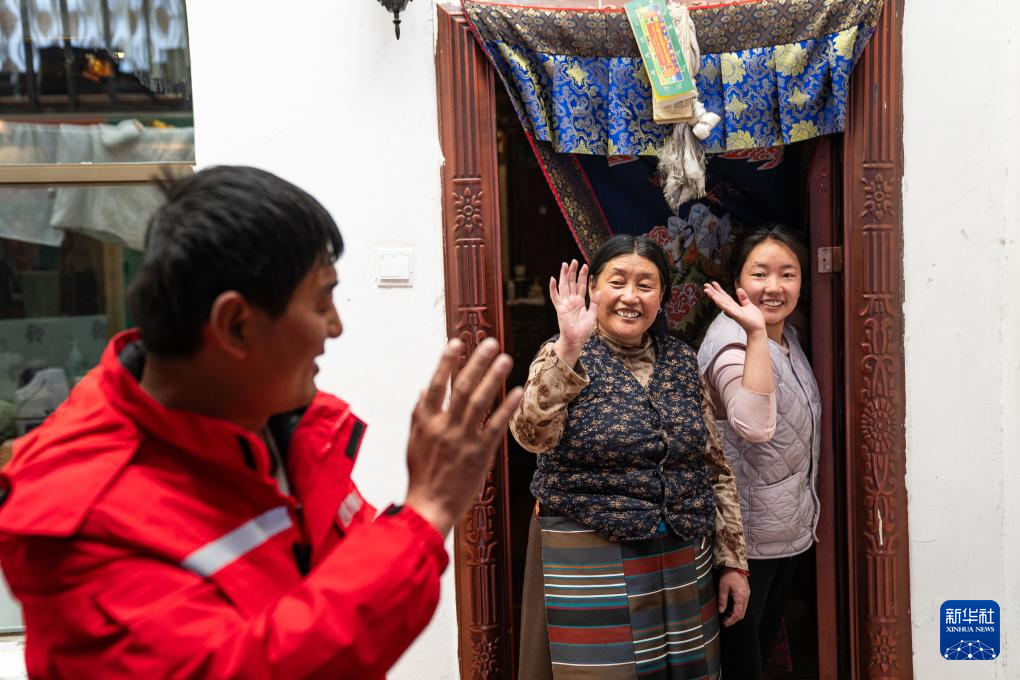 4月26日,西藏錦杭新能源有限責(zé)任公司工作人員入戶(hù)檢查完供暖情況后和居民道別。新華社記者 丁增尼達(dá) 攝