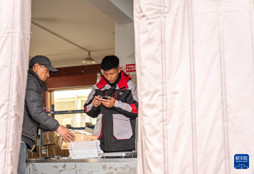 拉巴(左)在站點(diǎn)內(nèi)查看快遞信息(4月24日攝)。新華社記者 晉美多吉 攝