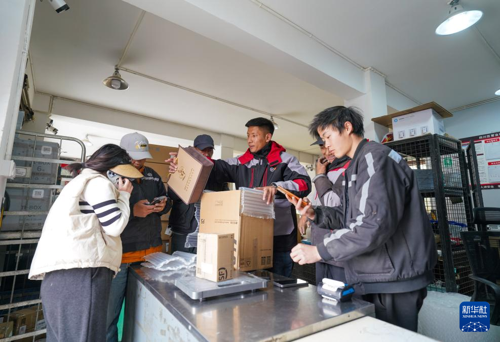 拉巴(左四)在站點(diǎn)內(nèi)打包快遞(4月24日攝)。新華社記者 晉美多吉 攝