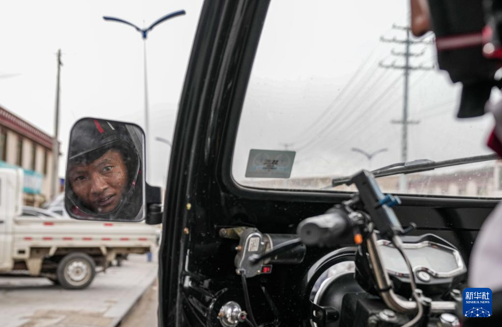 拉巴準(zhǔn)備去派件,他通過(guò)后視鏡檢查路況(4月24日攝)。新華社記者 晉美多吉 攝
