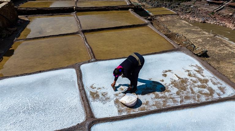 走進(jìn)加達(dá)村,便見村口的小攤位,那是加達(dá)村村民曲珍的鹽攤。曲珍從6歲開始便跟著母親下鹽井,“以前每天凌晨三四點(diǎn)起床,一直要干到晚上十點(diǎn)多才結(jié)束,現(xiàn)在有抽水泵就方便了很多?!庇捎诩彝ピ?,曲珍沒有上過學(xué),一直跟著母親制鹽,所以對(duì)制鹽工序如數(shù)家珍。曲珍告訴記者,井鹽生產(chǎn)流程大致包括取鹵、濃縮、注鹵、曬鹽、晾鹽、收鹽、運(yùn)銷、修整鹽田等。傳承千年的制鹽技術(shù),就是從鹽井汲取鹵水倒入貯鹵池存放5—6天,將貯鹵池中的鹵水灌注到鹽田中,依靠風(fēng)吹日曬析出鹽粒。而后,將結(jié)晶的鹽刮成弧形以充分脫水。每年的11月至次年6月為曬鹽季,其中3-5月為旺季。