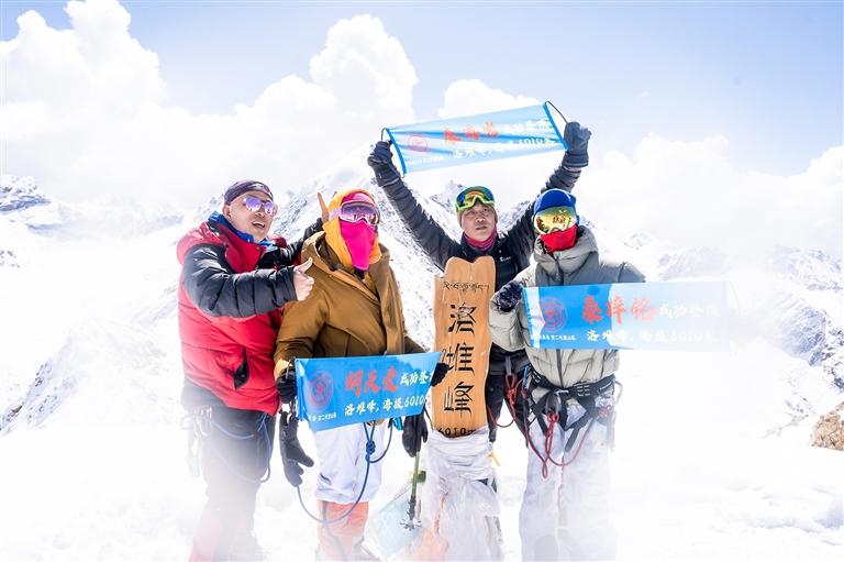 當(dāng)部分山友抵達洛堆峰一處近60度坡度冰面時,太陽緩緩升起,金色的陽光照射在山友們身上,寒冷、缺氧時刻考驗著每一個人,但大家邁著堅定的步伐繼續(xù)攀登。經(jīng)過數(shù)小時的攀登,來自西藏民族大學(xué)體育學(xué)院的3名學(xué)生,最先沖頂成功。隨后,陸續(xù)有山友安全挺進洛堆峰海拔6010紀(jì)念碑處。大家共同見證了雪山之巔的壯麗風(fēng)景。