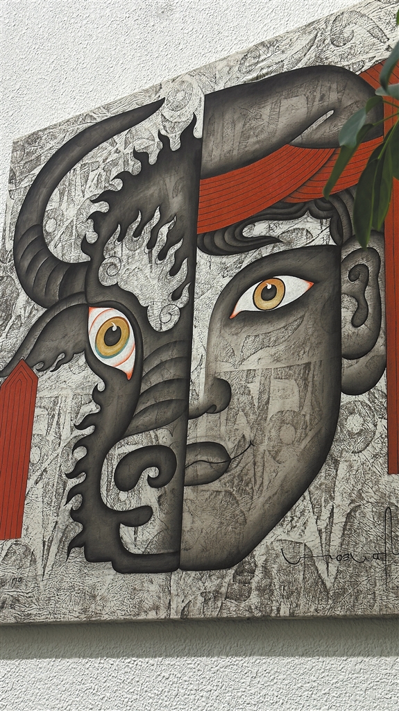 昂桑新作《十二生肖》中,藏式生肖圖騰與賽博朋克齒輪咬合,唐卡“三白法”渲染機械金屬光澤?!坝腥苏f我在解構傳統(tǒng),實則在編織文化‘經(jīng)緯線’。”他指著畫布說,“傳統(tǒng)不是凝固的酥油花,而是奔涌的河,接納現(xiàn)代支流,卻不忘雪山來處?!?/p>
