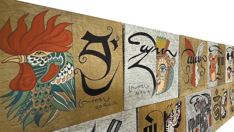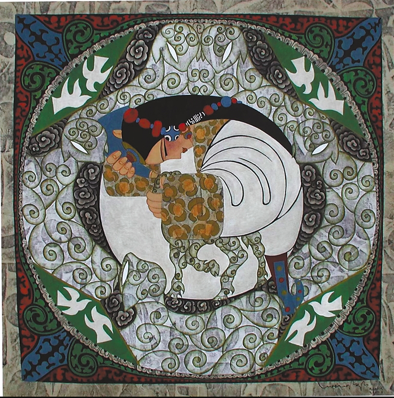 在昂桑的工作室中,《一日一畫》系列尤為醒目:藝術家采用布面重彩技法,讓唐卡礦物顏料與現(xiàn)代丙烯顏料滲透交融,傳統(tǒng)吉祥紋樣與幾何抽象圖案共生。韓書力評價:“他讓千年顏料與當代審美共振,完成傳統(tǒng)藝術的‘基因重組’?!?/p>