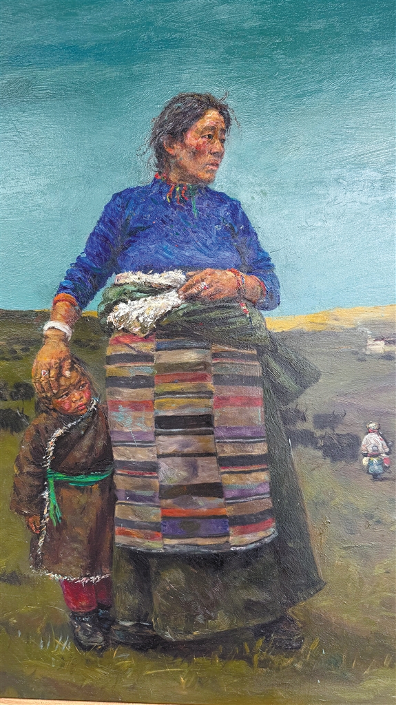 索朗白姆油畫作品《母與子》。