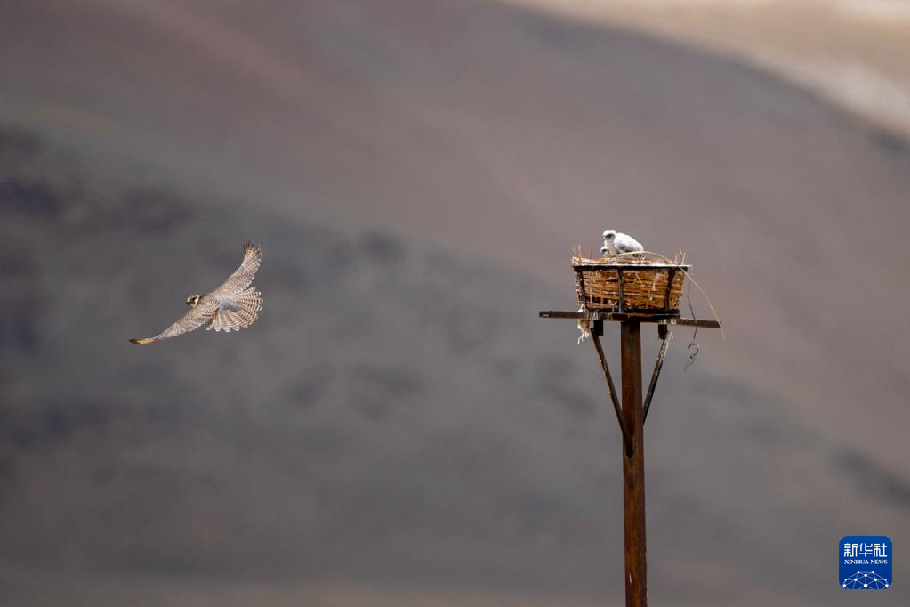 在羌塘草原上,一只游隼飛離鷹架上的巢(6月8日攝)。新華社記者 姜帆 攝