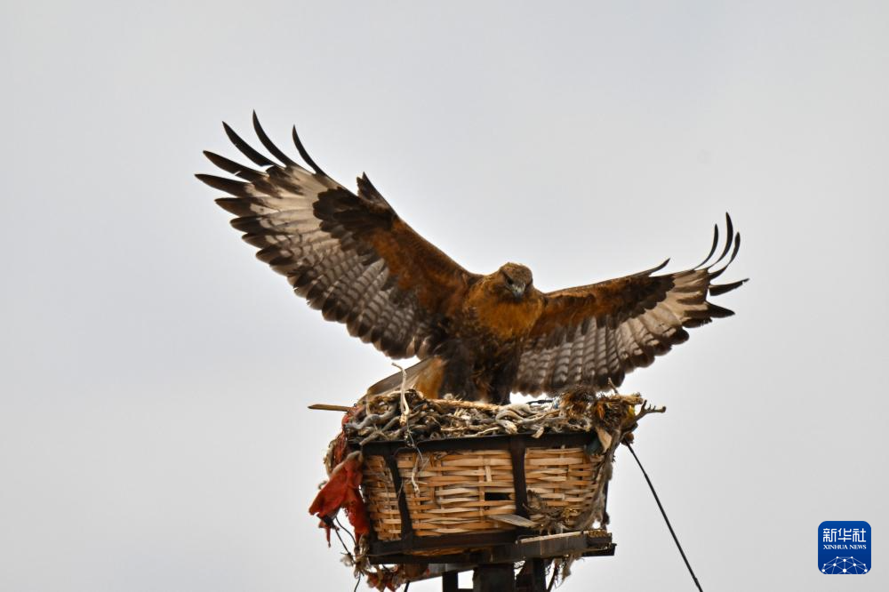 羌塘草原上的一只大鵟飛回鷹架上的巢(6月7日攝)。新華社記者 孫瑞博 攝