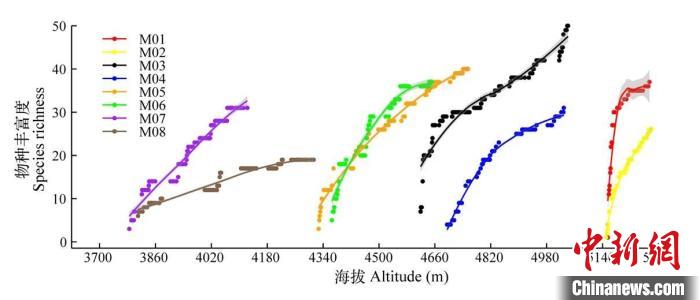 珠峰絨布河流域各個(gè)山體累計(jì)物種豐富度沿海拔高度的變化。M01–M08表示絨布河上游到下游所調(diào)查的8個(gè)獨(dú)立山體。中國(guó)科學(xué)院青藏高原研究所 供圖