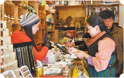 游客在吉隆鎮(zhèn)吉甫村購買當(dāng)?shù)靥厣唐贰@妥诩獢z